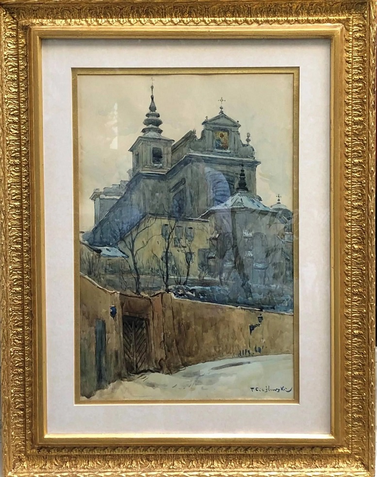 Lot 16. Tadeusz CIESLEWSKI ( Pologne 1870-1956). L’église Sainte Croix de Varsovie. Aquarelle sur papier, signée en bas à droite. Dans un beau cadre en bois doré. H. 47 x L. 30 cm (à vue). Estimate 400 – 600 €. Millon. 10/04/21