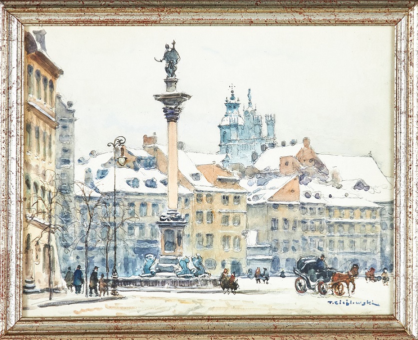 Ładny widok na Plac Zamkowy w Warszawie namalowany przez Tadeusza Cieślewskiego. Akwarela zbrązowiała, mocno zniszczona przez światło słoneczne.