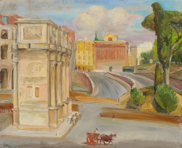 Lot 34. Zdzislaw CYANKIEWICZ DIT CYAN (Czechowice 1912 – Paris 1981). The Arch of Constantine and the Colosseum in Rome. Oil on canvas, 38 x 46 cm. Estimate 600 – 800 euro. Millon. 05/13/20