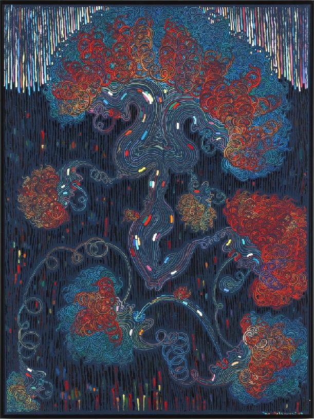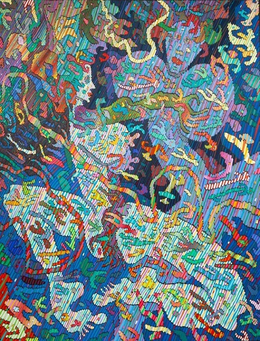 Jana Dobkowskiego świat muzyczny (lub cokolwiek innego) malowany falistymi kolorowymi liniami.