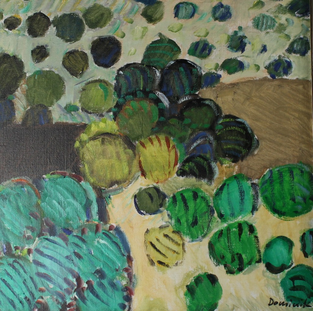 Expressive abstract composition from Dominik’s early period, composed of layered circular and rectilinear forms in warm ochres, golds, browns, and deep earth tones, built up with rich impasto and gestural brushwork. The surface is animated by rhythmic, organic repetitions suggestive of light, movement, and natural patterning—hallmarks of Dominik’s mature vocabulary.