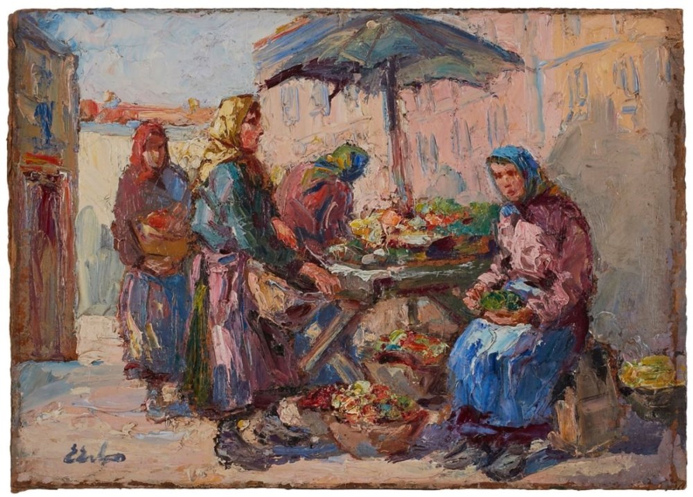 Lot 171. Erno Erb (Lemberg 1878-1943). Zwei Gemüseverkäuferinnen am Marktstand, signiert E. Erb, rückseitig Galerieetikett, Öl auf Leinwand auf Holz, 19,5 x 24 cm. Estimate 1,300 – 1,500 euro. Dorotheum. 09/15/21. Sold 1,700 euro