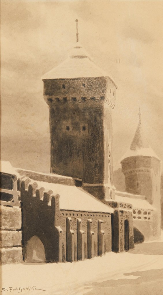 Lot No. 138-087401/0004. Stanislaw Fabijanski-Poraj (Paris 1865-1947 Krakau). Das Florianstor (Brama Floryanska) in Krakau im Winter, signiert St. Fabijanski, Aquarell auf Papier, 48 x 28 cm, gerahmt, verso Ausstellungsetikett des Salon Dziel Sztuki Krakau. Starting €240. Dorotheum. 08/19/25.