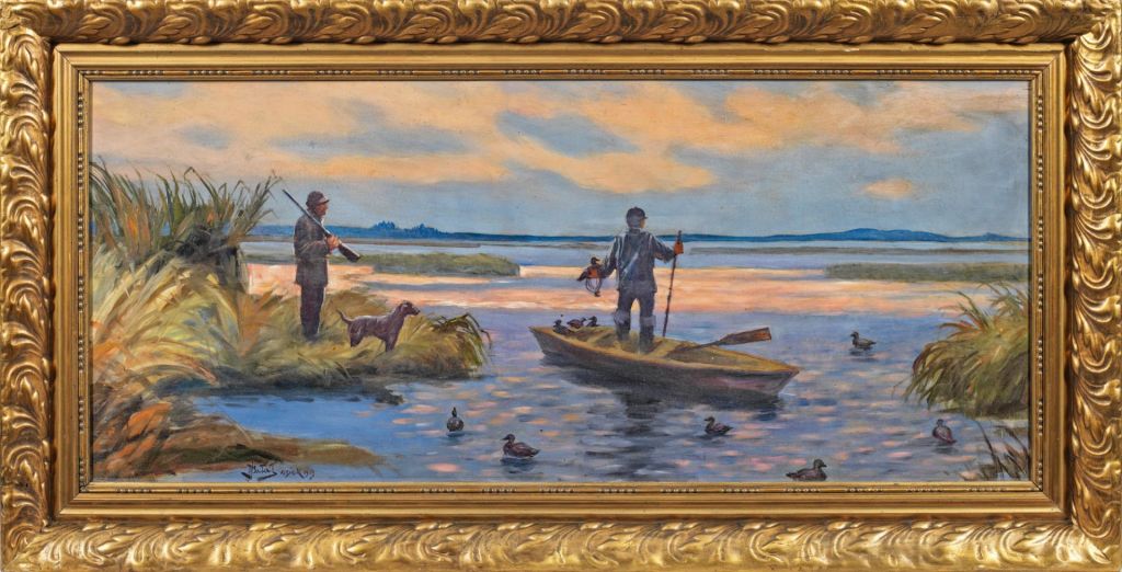 Lot 2708. Julian Falat (1853 Tuliglowy bei Lemberg – 1929 Bystra bei Bielsko-Biala). Entenjagd am Seeufer. Öl/Malkarton. L. u. sign. u. dat. 1919. 52 cm x 120 cm. Rahmen. Oil on cardboard. Signed and dated 1919. Estimate 18,000 – 36,000 euro. Schloss Ahlden. 09/09/23. Sold 15,000 euro