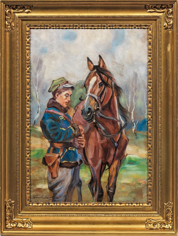 Lot 2709. Wojciech Kossak (1857 Paris – 1942 Krakau). Rastender polnischer Soldat mit seinem Pferd. L. u. sign. u. dat. 1922. 68 cm x 48 cm. Rahmen. Oil on cardboard. Signed and dated 1922. Estimate 5,500 – 11,000 euro. Schloss Ahlden. 09/09/23. Not sold