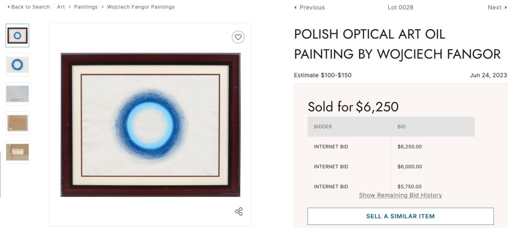 Jak to zatem się stało, że ten sam knot pojawił się rok później w Antique Arena z estymacją zaledwie $100 – 150 by zostać sprzedany za $6,250? (https://www.liveauctioneers.com/item/154885237_polish-optical-art-oil-painting-by-wojciech-fangor). Mogę zrozumieć, że Arena stosuje podpuchy cenowe by rozpalić bezrozumnych kolekcjonerów lecz dlaczego poprzedni właściciel z Heritage ($13,000) zdecydował sie na sprzedaż z tak wielką stratą?