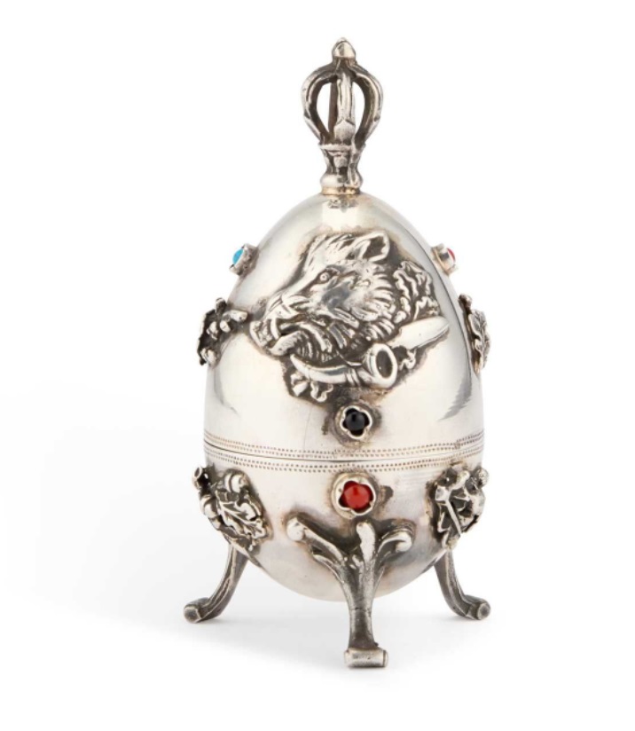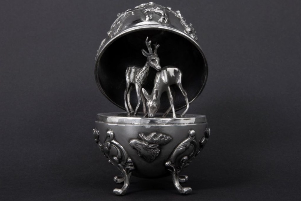 Lot 363. rare antique Polish silver Easter egg – marked “Warschau 84”, dated 1879 and with assay mark of Osip Sosnkovski || Zeldzaam antiek Pools eivormig sierstuk op pootjes, te situeren in de traditie van de paaseieren, versierd met bas-reliëfs met herten en bokkenkoppen en met binnenin twee hertjes – in massief zilver, gemerkt “84 Warschau”, gedateerd 1879 en met testmerk van Osip Sosnkovski – hoogte : 12,5 cm – gewicht : 366 gram. Estimate 700 – 1,500 euro. DVC Auctions. 03/02/24
