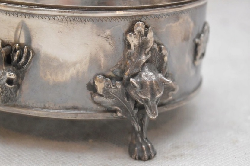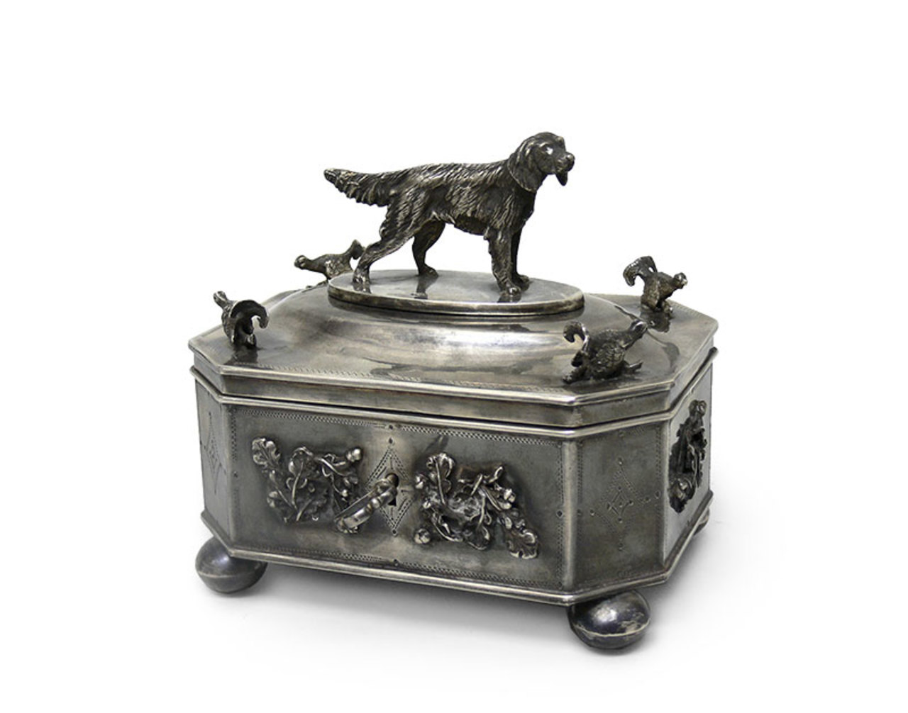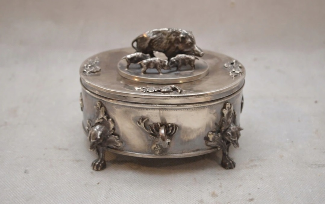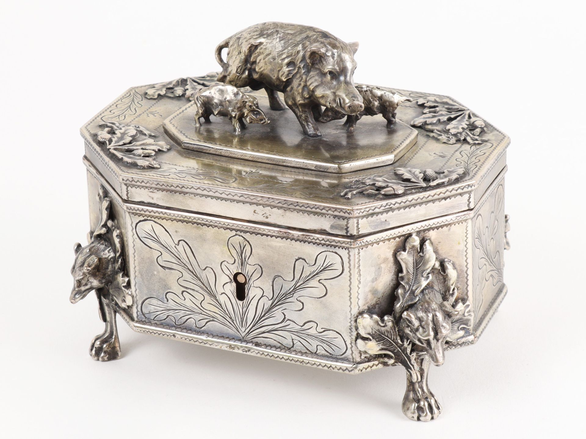 Lot 2793. Russland – Zuckerdose Silber, punz. 84 zolotniki, Beschauermarke Josef Sosnkowski, 1896, Warschau, aufwendig gestaltete Zuckerdose auf vier relieferten Tatzenfüßen m. plastischem Wolfskopf, oktogonaler Korpus m. passendem flachen Scharnierdeckel, auf oktogonaler flachen Plinthe naturnah gestaltete plastischen Darstellung eines Wildschweines m. zwei Frischlingen, reicher reliefierter Eichenblattdekor m. springenden Hasen, umlaufend reicher Gravur- u. Ziselierdekor, Eichenblattmotiv u. Zackenfries, innen leicht kupferfarbend, Schauss. Schloss, 1 Schlüssel, im Boden leichte Blasen, feine Kratzer, Alterssp., Hca. 10,5 cm, Lca. 14 cm, Gges. ca. 624g. Starting 1,200 euro. Auktionshaus Franke. 01/27-29/22