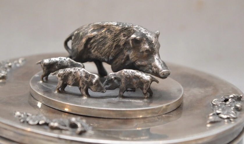 Bonusem do tej cukiernicy jest działający zamek oraz kluczyk. Ten kluczyk to doprawdę rarytas bo niewiele ich się uchowało. Mamy zatem komplet, warty co najmniej 1,200 euro. Cukiernica ma charkter ‘myśliwski’ z dzikami (łocha z warchlakami) ustawionymi na górnym medalionie oraz głowami wików lub niedźwiedzi(?) wpasowanymi w boki oktagonalnej skrzynki. To dopiero jest raytas z końca XIX wieku, zachowany w stanie idealnym. Czyżby?
