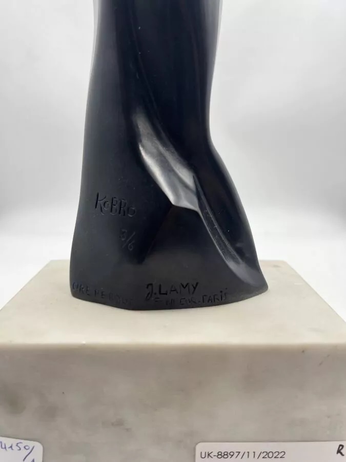 Lot 161. ECOLE XX SIECLE dans le goût de Katarzyna KOBRO (1898-1951). Nu cubisant, c.1960 Bronze à patine noire, cire perdue, porte la signature KOBRO sur la base, tirage 3/6, cachet du fondeur J.Lamy. Hauteur 57 cm, avec socle : 64 cm. Estimation: 8,000 – 10,000 EUR. Boisgirard Antonini. 07/04/23. Usunięto z licytacji
