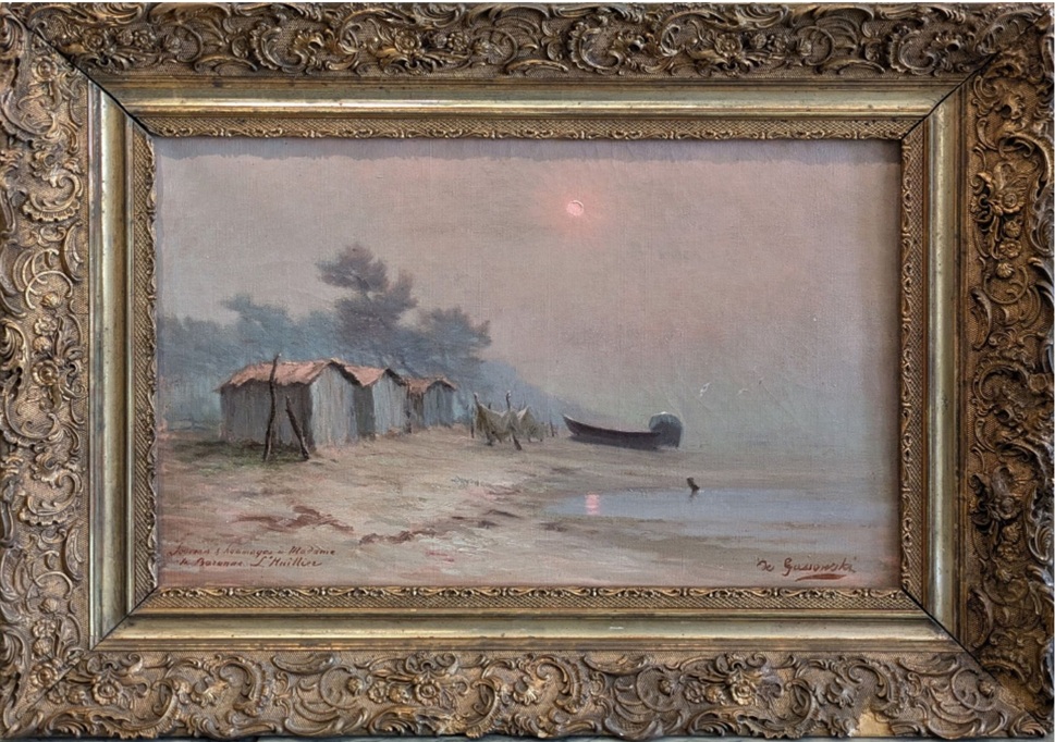 Lot 94. Alexander DE GASSOWSKI (1835-1895): BEACH-SIDE LANDSCAPE AT SUNSET. Oil on canvas, signed lower right, with a consignment to the Baroness L’Huillier lower left. 35 x 55 cm. Old restoration, chips. Estimate 200 – 300 euro. Jean-Marc Delvaux. 03/21/25. Sold 600 euro
