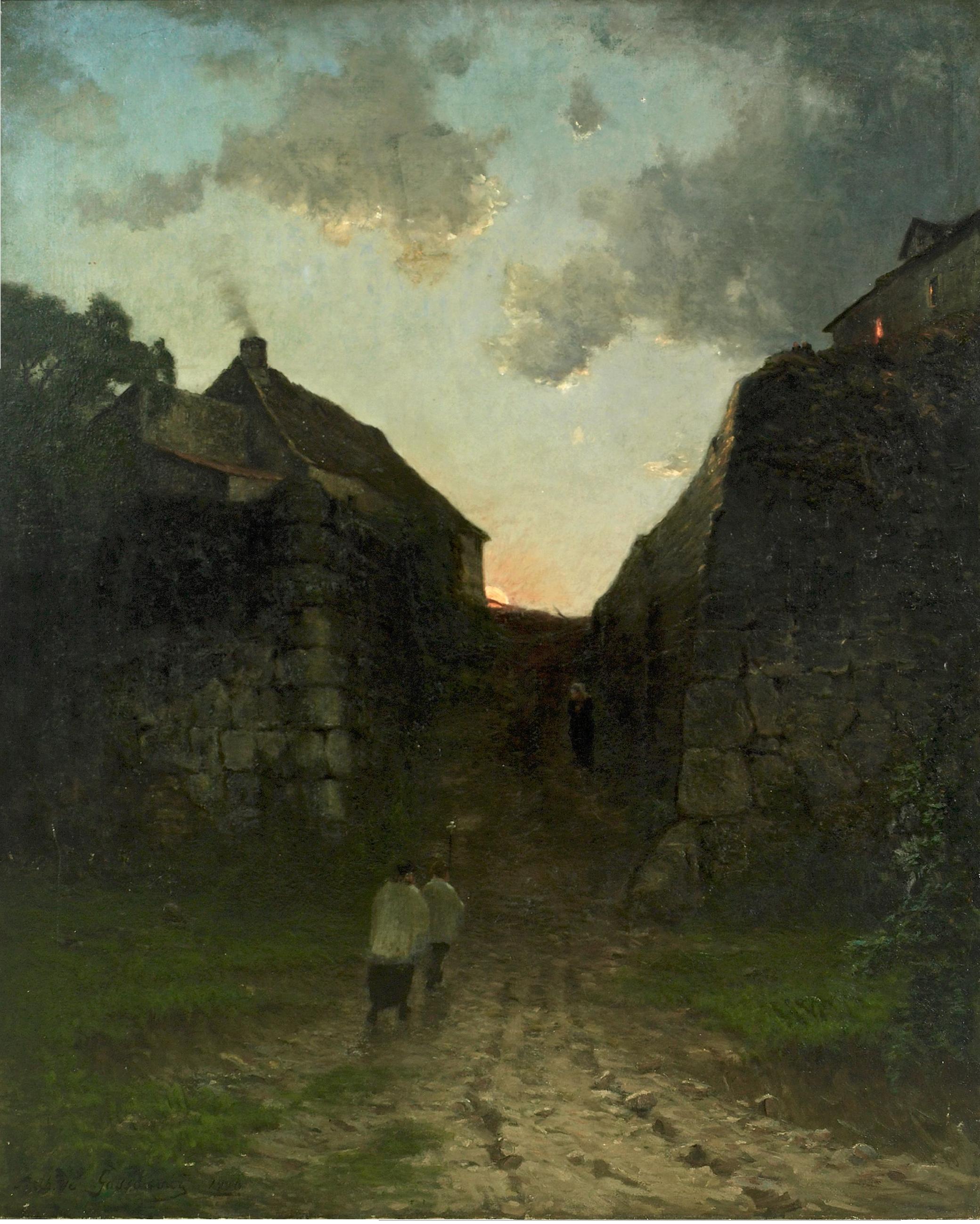 W katalogu Millon znalazłem obraz autorstwa Aleksandra Gąssowskiego, z numerem katalogowym 5, pod tytułem „Return to the moonlight” lub ewentualnie „Le retour au clair de lune”, co pewnie oznacza to samo. Pierwsza sprawa, nie wiem skąd wziął się taki tytuł i to mnie intryguje. Ekspert katalogu, Maurice Mielniczuk ma chyba polskie korzenie i jedynie młody wiek eksperta może tłumaczyć (ewentualnie pośpiech przy przygotowaniu katalogu) do pewnego stopnia brak zrozumienia tematu tej pracy. Wydaje mi się, że poprawiejszy tytuł byłby ‘Z wiatykiem’ ale nie wiem czy w zlaicyzowanej Francji ten termin jest nadal znany. Najwyraźniej widzimy na obrazie księdza z ministrantem idącego z sakramentem o świetle księżyca do chorego, prawdopodobnie umierającego człowieka. Ten obraz jest bardzo dobry a scena skłania do myślenia o kruchości życia człowieka i przemijaniu a nie o blasku księżyca. Druga sprawa, to czy autorem jest Aleksander Gąssowski czy też Artur Gąssowski. Kilka lat temu niemal identyczna kompozycja (chyba jednak lepiej namalowana, patrząc np. na chmury) była sprzedana pod nazwiskiem Artura (podobno kuzyna Aleksandra) Gąssowskiego (https://polishartcorner.com/2014/05/20/artur-gassowski-1840-1911-2/):