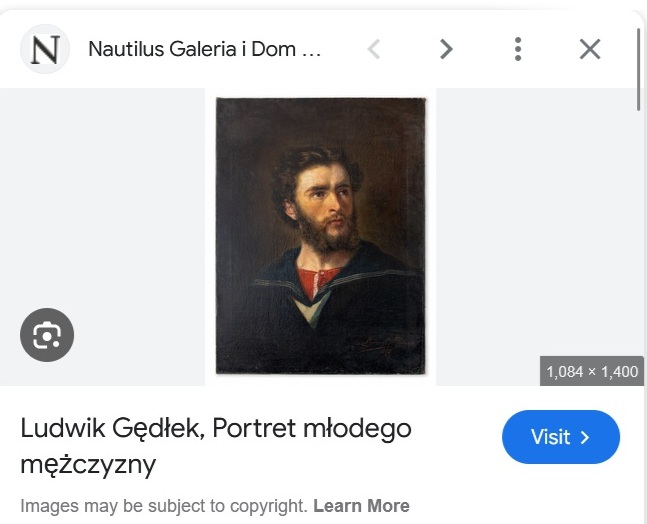 Dwa obrazy Luwika Gędłka za aukcjach europejskich. Jeden słaby obraz w Dorotheum, za to w dobrej ramie, wysoko wyceniany. Słabość tego oleju widać dośc dobrze patrząc na powiększone szczegóły wymęczonych koni, smutnych jeźdźców, bezruchu sytuacji. Drugi obraz, portret mężczyzny, jest na aukcji w Dusseldorfer Auktionshaus. Jest to niezły portret marynarza(?), opisany przez dom aukcyjny jako autoportret artysty w marynarskim stroju. Nie wiem na jakiej podstawie artysta miałby się sportretować w stroju marynarza (studiował daleko od morza przez wiele lat w Krakowie a potem przeniósł się Wiednia). Być może jest to chwyt domu aukcyjnego aby obraz lepiej się sprzedał, gdyż autoprtrety malarzy są poszukiwane w odróżnieniu od portretów nieznanych mężczyzn. Wyjaśnienie, kim jest portretowany, sprowadza się na tereny Polski bo obraz ten był nieskutecznie licytowany na portalu Onebid w 2024 roku przez krakowski dom aukcyjny Nautilius z opisem ‘Portret młodego mężczyzny‘ i wyceną 12,500 PLN. Obrazu wówczas nie sprzedano i obecnie przywędrował do Dusseldorfu już z innym opisem.
