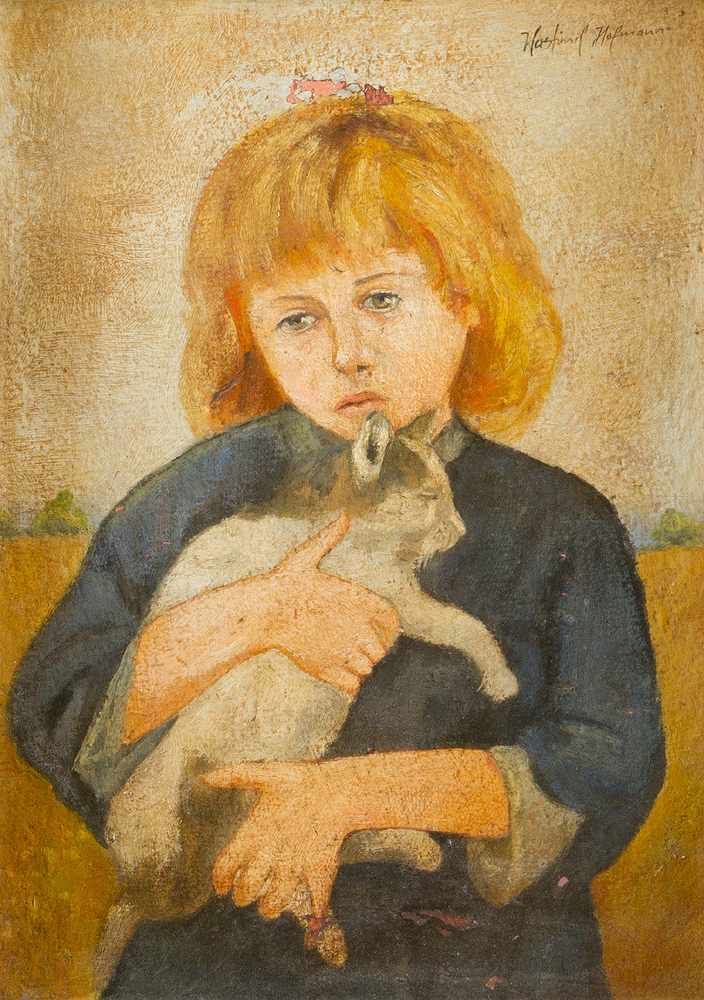 Lot 207. Wlastimil Hofmann (1881-1979)- attributed, Girl with cat, oil on card board described upper right framed on the reverse old polish paper label with description; 34x23cm. Estimate 50-100 euro. Art Antique Gallery & Auctioneers E. P. Deutsch. 04/09/19