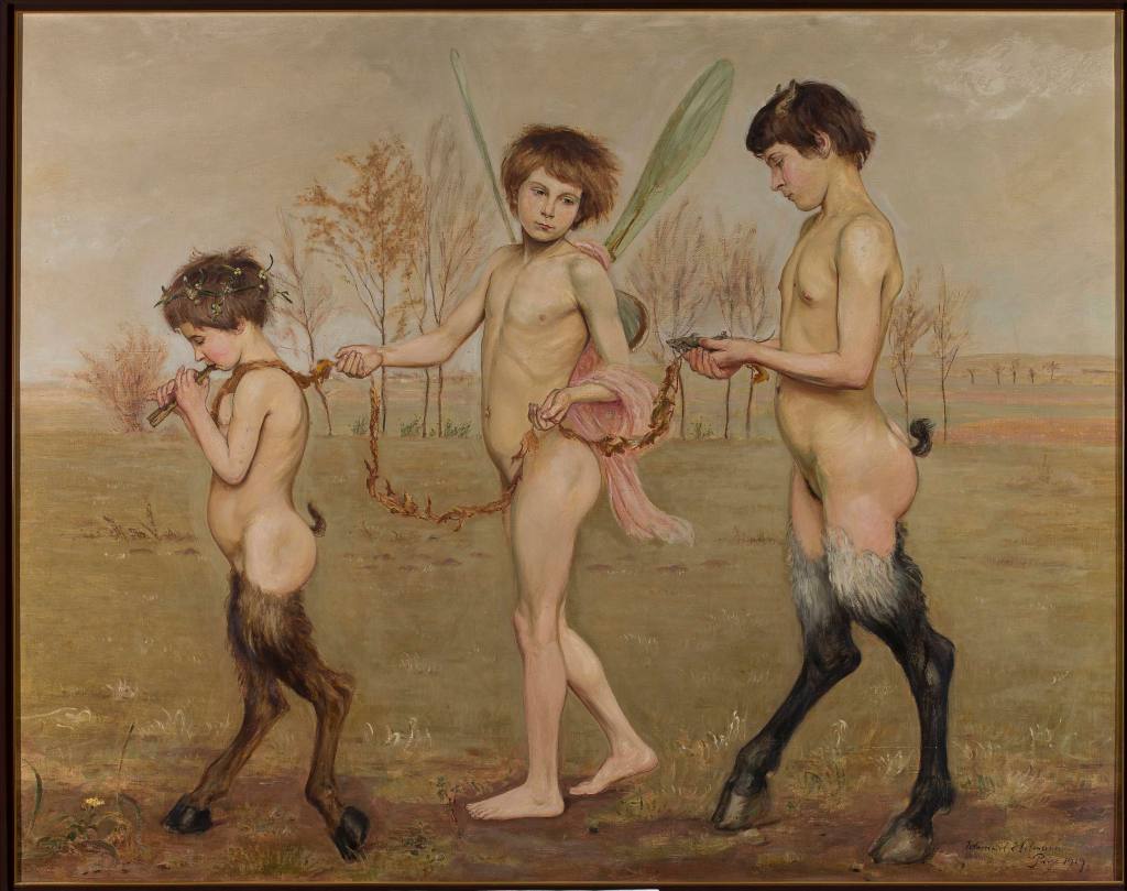 Wlastimil Hofman ?Symbolistische Szene mit einem Hirtenknaben beim Bekrönen eines Engels mit einem Blütenkranz.