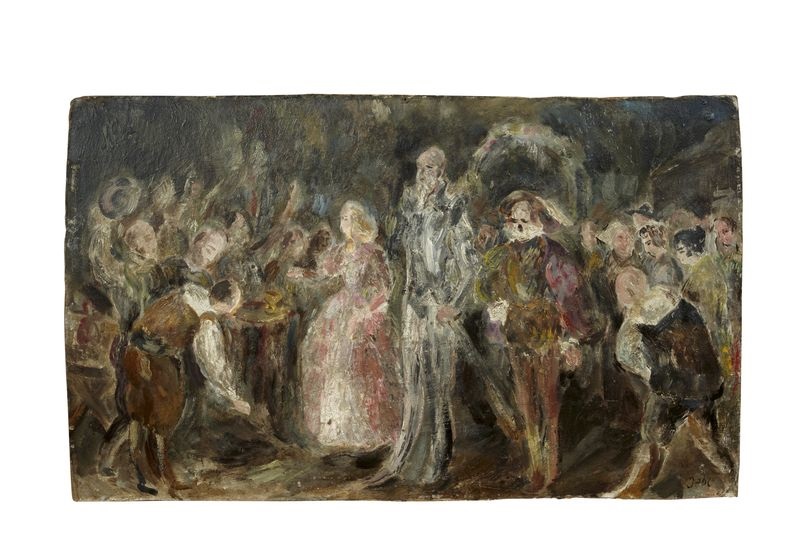 Lot 214. Wladyslaw Alojsy JAHL (Jaroslaw 1886 – Paris 1953). Don Quichotte et Dulcinée Huile sur carton. 26,5 x 44 cm. Signé en bas à droite Jahl. Porte au dos les indications manuscrites Bodas de Gu macho. Estimation : 600 € / 800 €.