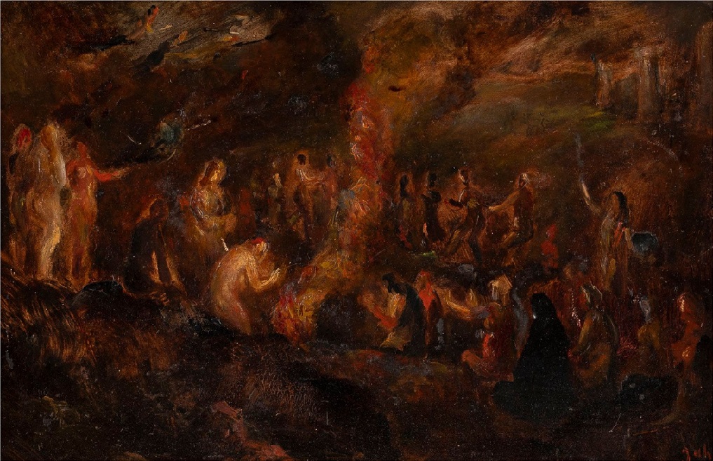 Lot 1977. WLADYSLAW JAHL 1886 Jaroslaw – 1953 Paris. Witches. Oil on cardboard. 26 x 39 cm (F. 38 x 51 cm). Signed lower right ‘Jahl’. Part. damaged, rest. Frame. Provenance: private collection Rhineland-Palatinate. Estimate 220 440 euro. Hargesheimer. 09/10/21
