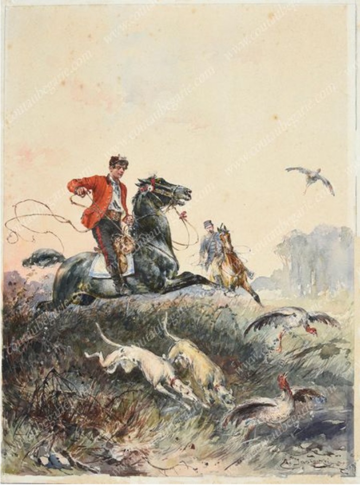 Polowanie par force na ptactwo. Zręczna akwarela w wykonaniu Czesława Jankowskiego, którego prace są stosunkowo często spotykane we Francji.