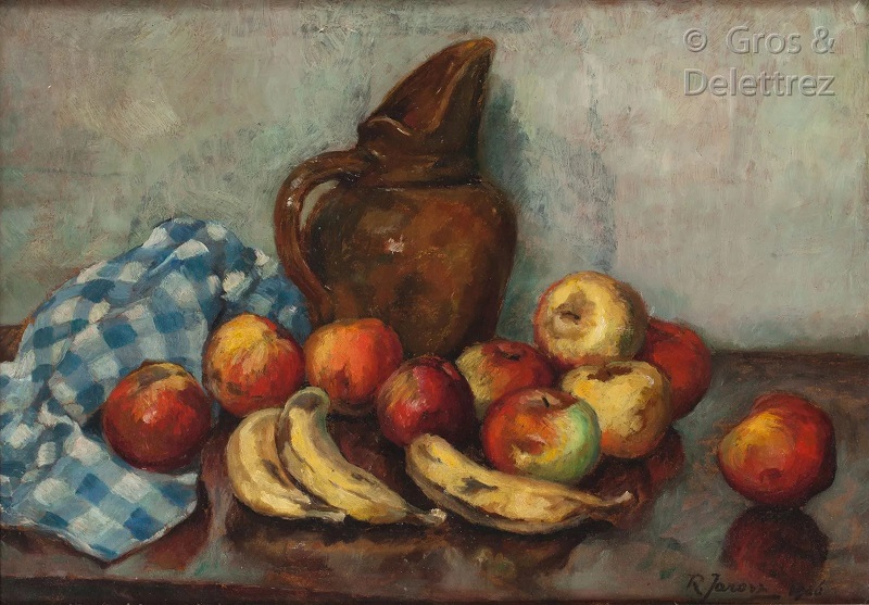 Lot 164.ROMAN JAROSZ (Rava-Rouska 1888 Paris 1932). Nature morte aux pommes et bananes. Huile sur carton. Signé et daté en bas à droite « R Jarosz 1926 », 44 x 63 cm. Estimation 500 – 600 €. Gros & Delettrez. 07/09/20