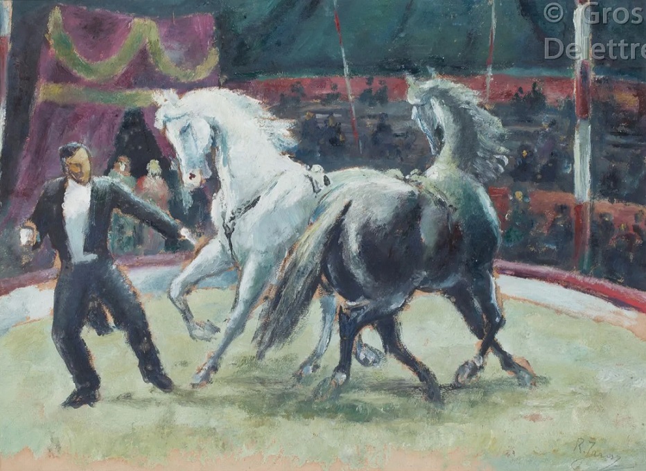 Lot 204. Roman JAROSZ (Rava-Rouska 1889 Paris 1932). Dresseur de chevaux au cirque. Huile sur papier. Signé en bas à droite ‘R. Jarosz, 40,5 x 55 cm. Estimation 500 – 600 €. Gros & Delettrez. 07/09/20
