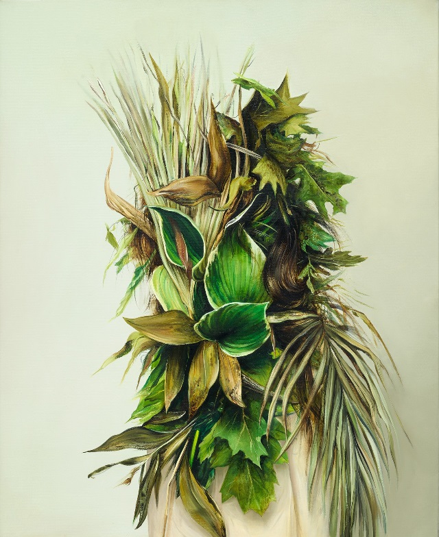 “In these paintings, by covering or modifying a portrait, I want to disrupt the known order and shatter the uniform and conservative image of female beauty. Through a metamorphosis of classical paintings, I change their interpretation and provoke new, alternative associations… By interweaving elements relating to the canon and tradition with elements derived from nature and the senses, I want to release the expression, emotion, and vitality previously hidden by convention.”