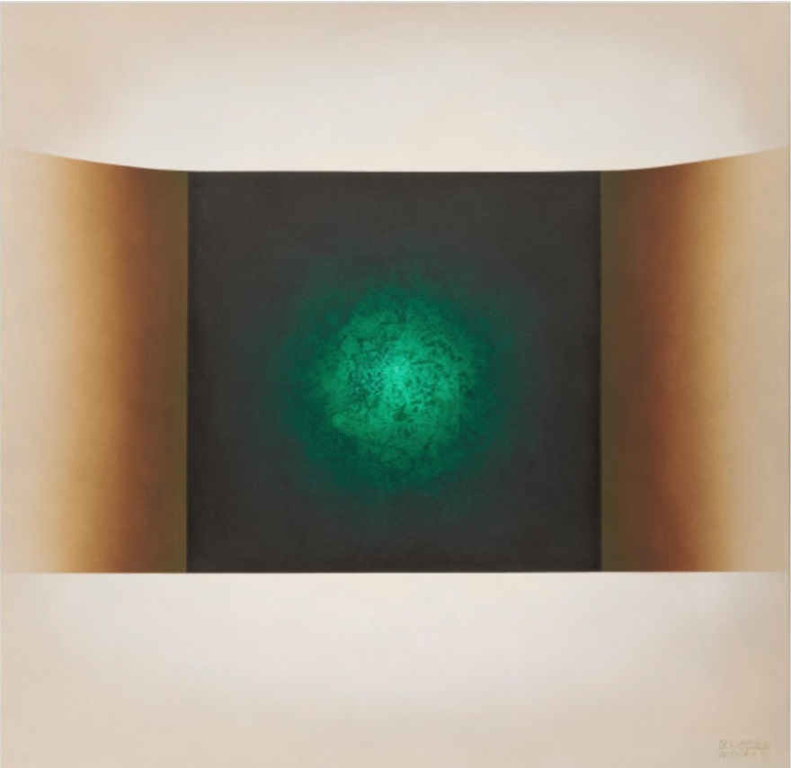 Lot 98. WITOLD KACZANOWSKI Polish, b. 1932. Green Hole, 1991, oil on canvas, signed, dated, and dedicated To Claude-L. Witold-K 91 lower right, 48 x 48 in. Estimate: $3,000 – $5,000. Grogan and Company. 05/06/23