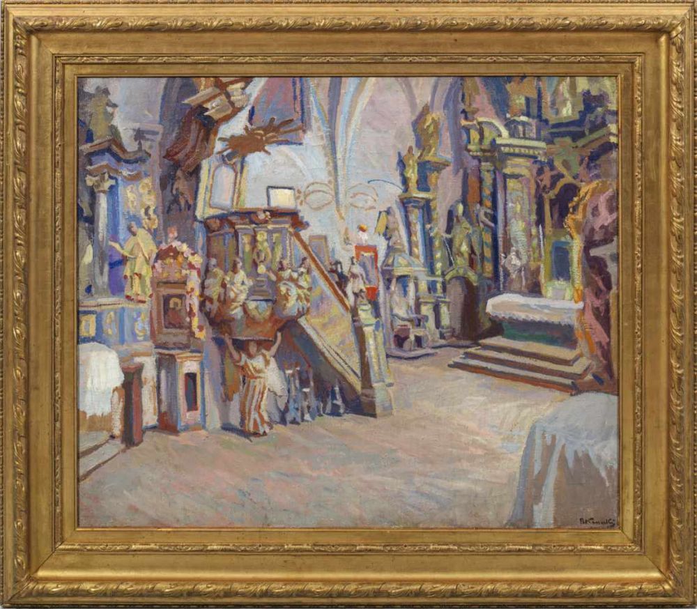 Lot 1348. Stanislaw Kamocki (1875 Warsaw – 1944 Zakopane). Interior view of the church of St. Stanislaw (St. Stanislaus) in Frydman (Friedmann)// Large-format, impressionistic work from the artist’s early oeuvre, probably from 1911, painted with a soft pastose style and in a light, pastel colouring. Kamocki studied from 1891-1900 at the Cracow Academy of Art under Jan Stanislawski, the founder of modern Polish landscape painting, and became one of his most important students; through two scholarships in Paris in 1901/02 and 1904/05 he also became acquainted with current international art trends. Kamocki, who belonged to the “Mloda Polska” (Young Poland) movement, preferred to paint outdoors and found the motifs for this on long journeys through Poland and neighbouring areas. From 1919 Kamocki headed the landscape painting class at the Krakow Academy, and in 1937 he became a professor. From 1899 on, he participated in numerous exhibitions, from 1906 also in the exhibitions of the Vienna Secession, of which he was a member from 1911 to 1918. Kamocki’s works can be found in the National Museums in Krakow and Warsaw, among others. Oil/floodwood; r. and signed; verso with reference to the date and verso 1911. 85 cm x 104 cm. Frame. /V/Oil on canvas. Signed. Inscribed and dated 1911 on the reverse. Estimate 8,500 euro. Schloss Ahlden. 09/06/20