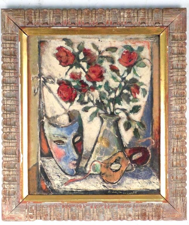 Lot 280. Eliasz Kanarek (Polish, 1901/02-1969). Still life with masks and flowers, signed lower right, oil on masonite. 17″ H X 14″ W (23″ X 20″). Estimate $ 2,000-3,000. Hutter. 1/17/15.