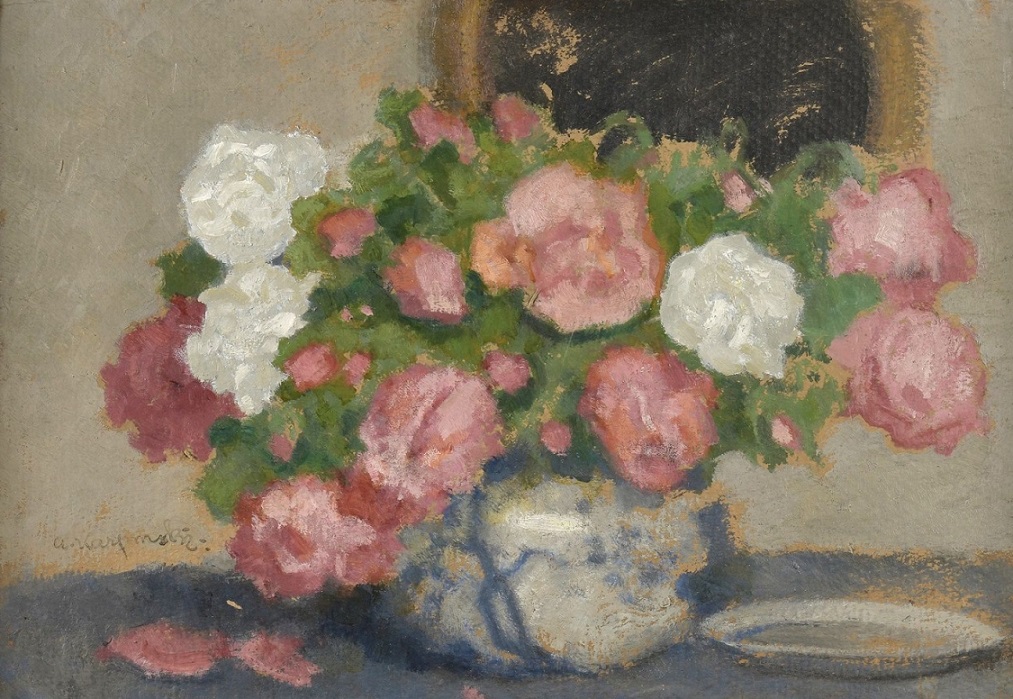 Dość sztampowa martwa natura z więdnącymi różami Alfonsa Karpińskiego. Powielanie tematu
