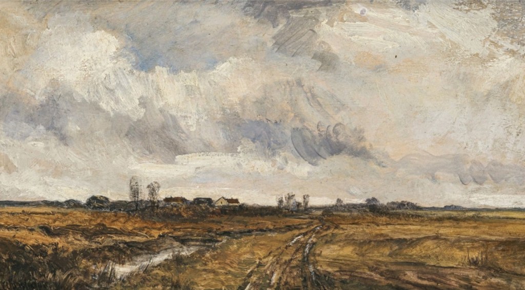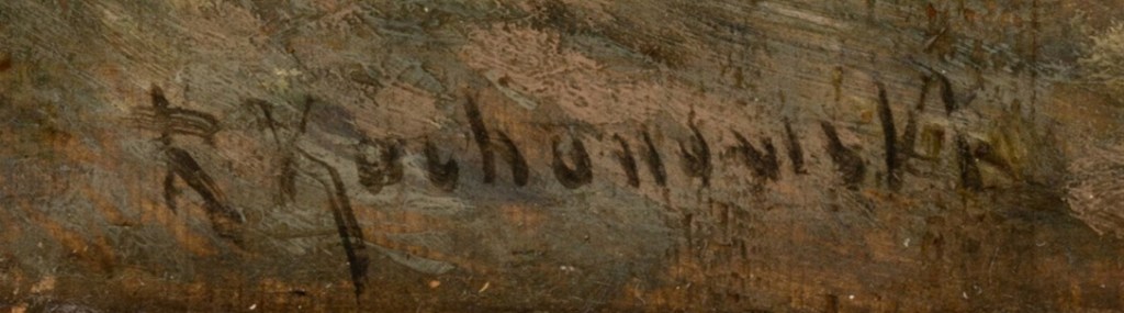 Niemiecki Neumeister jest uważany za bardzo porządny monachijski dom aukcyjny. Niemniej pejzaż, który pojawił się na grudniowej aukcji jako Romana Kochanowskiego nie wygląda na pracę tego malarza. Są na tej pracy pewne elementy podobne do twórczości RK, które mogą wprowadzić w błąd. Jest to rzeczywiście pejzaż mogący uchodzić z okolic Dachau z przełomu XIX/XX w., równina przedzielona strumykiem, z błotami i nielicznymi drzewami, z murowanymi budynkami ustawionymi na horyzoncie, czyli to co można spotkać na niektórych pracach RK. Około 2/3 obrazu zajmuje pochmurne niebo (Kochanowski został nazywany w jednym z opracować ‘malarzem pochmurnego nieba’). Na horyzoncie można dopatrzeć się topoli podobnie malowanych jak przez RK pędzlem ze szczeciny. Jednak, dukt pędzla, szczególnie przy malowaniu chmur jest niepodobny do Kochanowskiego no i oczywiście brudna kolorystyka, pomieszanie czerni z brązami dający w sumie ponury obraz – pierwsze moje wrażenie było, że jest gwasz a nie olej. Byłaby to nietypowa wymiarami dla RK praca namalowana na dużym kartonie. Artysta ten większe wymiarami prace, które powstały przed 1900 rokiem malował na płótnie ewentualnie na papierze, później naklejonym na płótno. Nie potrafię rozszyfrować sygnatury (być może została błędnie odczytana) lecz i z nią czy bez niej nie da się tej pracy przypisać Kochanowskiemu. Myślę, że przed aukcją zniknie z katalogu lub pojawi się z inną atrybucją bo moim zdaniem jest to praca innego artysty.