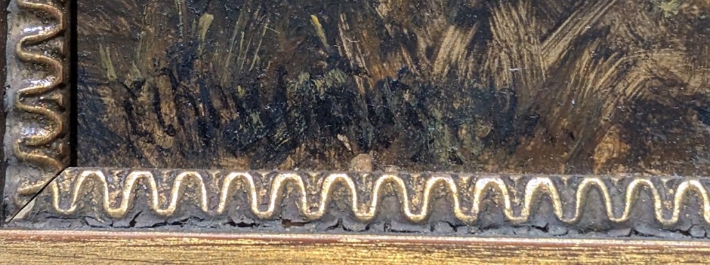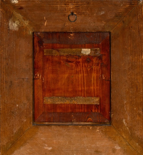 Podłoże malarskie – tę kwestię bez oględzin pracy na żywo ocenił Pan błędnie. Definitywnie nie jest to deska przygotowana przez profesjonalnego dostawcę materiałów malarskich, a tym bardziej nie jest to sugerowany mahoń. Jest to barwiona deska, z europejskiego gatunku drewna z dużymi, wyraźnymi sękami i ręcznie wykonanym fazowaniem.
