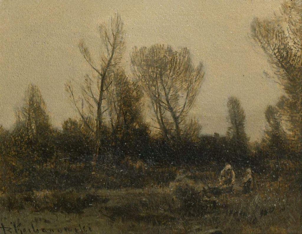 Lot 615. KOCHANOWSKI, ROMAN 1857 Krakau – 1945 Freising. Landschaft mit Reisigsammlern. Öl auf Papier auf Holz. L. u. signiert. 16 x 22 cm. Rahmen. Estimate 1,800 euro. Scheublein Art & Auktionen. 03/27/25. Sold €1,800
