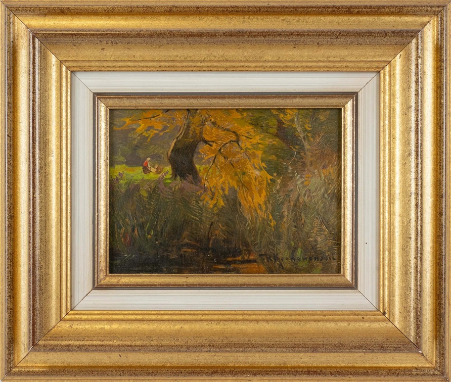 Lot 620. KOCHANOWSKI, ROMAN (WOHL) 1857 Krakau – 1945 Freising. Herbstlicher Wald. Öl auf Holz. L. u. monogrammiert und datiert 24/10 (1)921. Restauriert (?). Ca. 19,5 x 27,5 cm. Rahmen. Starting €1,200. Estimate €1,400. Scheublein Art & Auktionen. 09/25/25. Sold €3,400