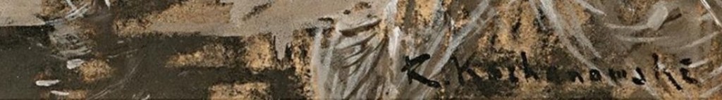 Na dokładkę, olej ten namalowany jest na grubej desce (mahoniowej?), specjalnie przygowowanej w zakładzie sprzedającym artykuły dla malarzy. To pierwsza taka gruba deska, którą widzę użytą przez RK. Kochanowski stosował cienkie deseczki, sklejki, czasami malował na wieczkach pudełek cygar, które namietnie palił. Nawet deska malarska tutaj nie pasuje i jej niespotykany, niemal ‘kwadratowy’ wymiar. W sumie oceniam tę pracę jako falsyfikat uchodzący za pracę Romana Kochanowskiego, namalowany nie wiadomo przez kogo, na któym położono sygnaturę po śmierci krakowskiego artysty. Przykro widzieć falsyfikat krakowskiego artysty sprzedawany w krakowskim salonie. Sądzę, że ten fals nie został celowo wprowadzony do obiegu a raczej przez dużą niedbałość właściciela lub jego pracowników. Chętnie zamieszczę polemikę z Koneserem jeśli ma inne zdanie i uważa ten obraz za autentyk.