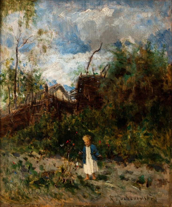 Ad 4. Postacie dzieci bardzo rzadko pojawiają się u RK i w zasadzie tylko jako pastuszkowie. We wczesnym okresie pastuszkowie są malowani dość dokładnie, zaś im dalej tym bardziej plamowo i niezwykle rzadko. Tutaj znowu nie pasuje mi ta postac dziecka (jak z Kostrzewskiego) do późnego, na podstawie sygnatury, okresu. U Kochanowskiego na obrazach dominują zgarbione babiny a nie dzieci. Obecność takiego, detaliczne namalowanego, dziecka stanowiłoby do pewnego stopnia cymes u RK. Dodam, że osoby na pracach RK należy traktować jako sztafaż pejzażu a nie portrety, dopełniają one krajobrazy a nie są przedmiotem samym w sobie. Wspomniałem, że postać dziecka została namalowana bardzo detalicznie czego nie znajdziesz na innych pracach przedstawiających ludzkie postaci.