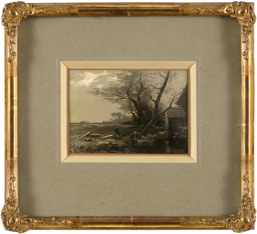 Lot 3621. Kochanowski, Roman 1856 Krakau – Freising 1945. Bäuerin in einer Moorlandschaft. Öl/Karton. Sign. 9,5 x 16,5 cm. Verschmutzt. Beschädigungen im Bereich des Rahmens. Opening 900 euro. Auktionshaus Ursula Nusser. 05/07/24. Sold 1,400 euro