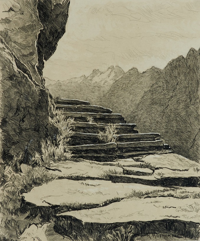 Lot 3308. Roman Kochanowski (Krakau 1857-1945 Freising), Stufen im Hochgebirge. Kohle, weiß gehöht, auf Bütten. Sign., nicht dat. (um 1920). 44,7 x 37,6 cm. – Leicht gebräunt. Estimate 150 – 200 euro. Zisska & Lacher. 06/07/24. Sold 1,300 euro