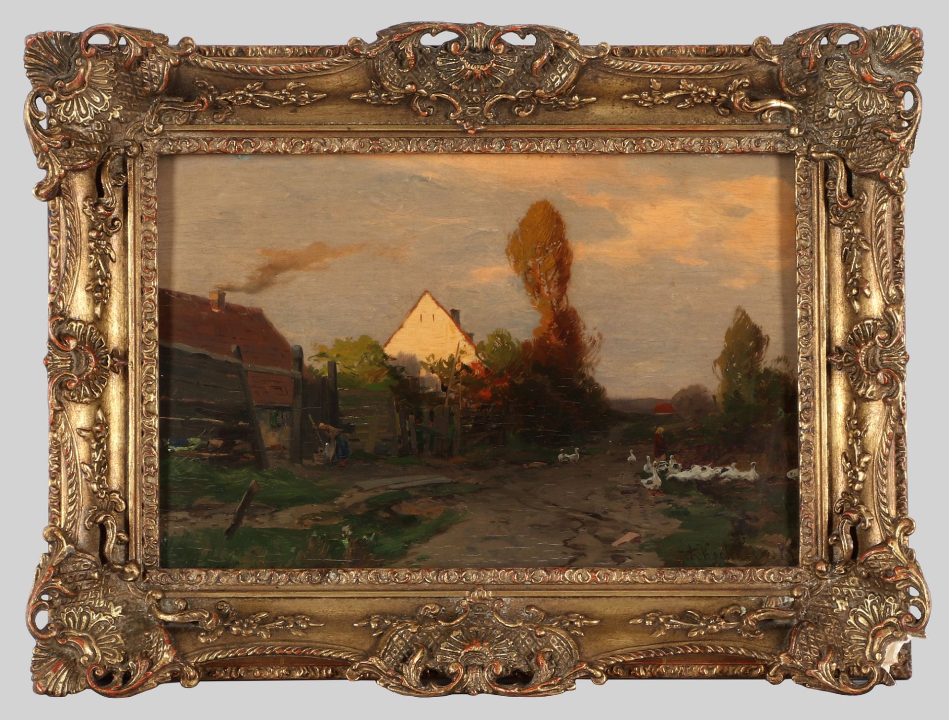 Lot 397. Roman Kochanowski, r.u.sig., Krakau 1857 – 1945 Freising, “Gänsehüterin auf der Dorfstraße“, Öl/Holz, 24 x 36 cm, Farbfehlstellen. Opening 800 euro. Auktionhaus Arnold. 06/10/23. Sold 4,500 euro
