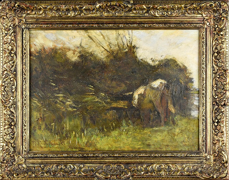 Lot 232. Roman Kochanowski 1857 Krakau – 1945 Freising. Autumn landscape with cattle. Monogrammed R.K. lower left. Adhesive label with information about the restoration in June (19)78 verso. Oil auf canvas on thin cardboard on panel. 18 x 13.2 cm. Minor restoration. Framed (26 x 21.5 cm). Estimate 1,500 – 1,800 euro. Neumeister. 03/20/24. Sold 3,000 euro