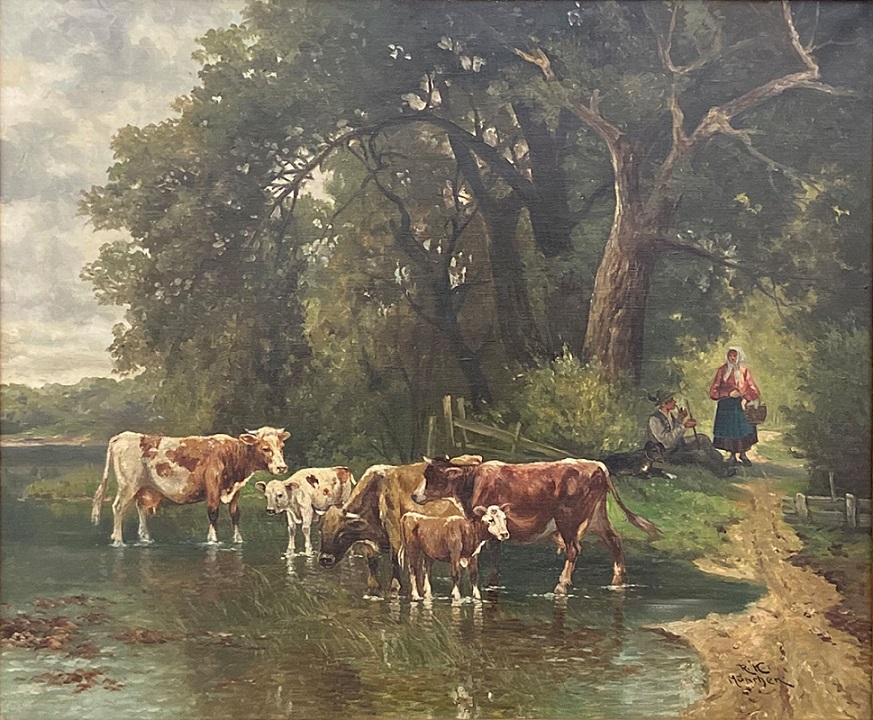 Lot 144. Roman Kochanowski 91857 – 1945). “Bauern mit Kühen” Öl auf Leinwand Größe: 50,5 x 60 cm Monogrammiert und Ortsbezeichnet: München. Starting 400 euro. Auktionshaus Miltenberg. 05/08/21