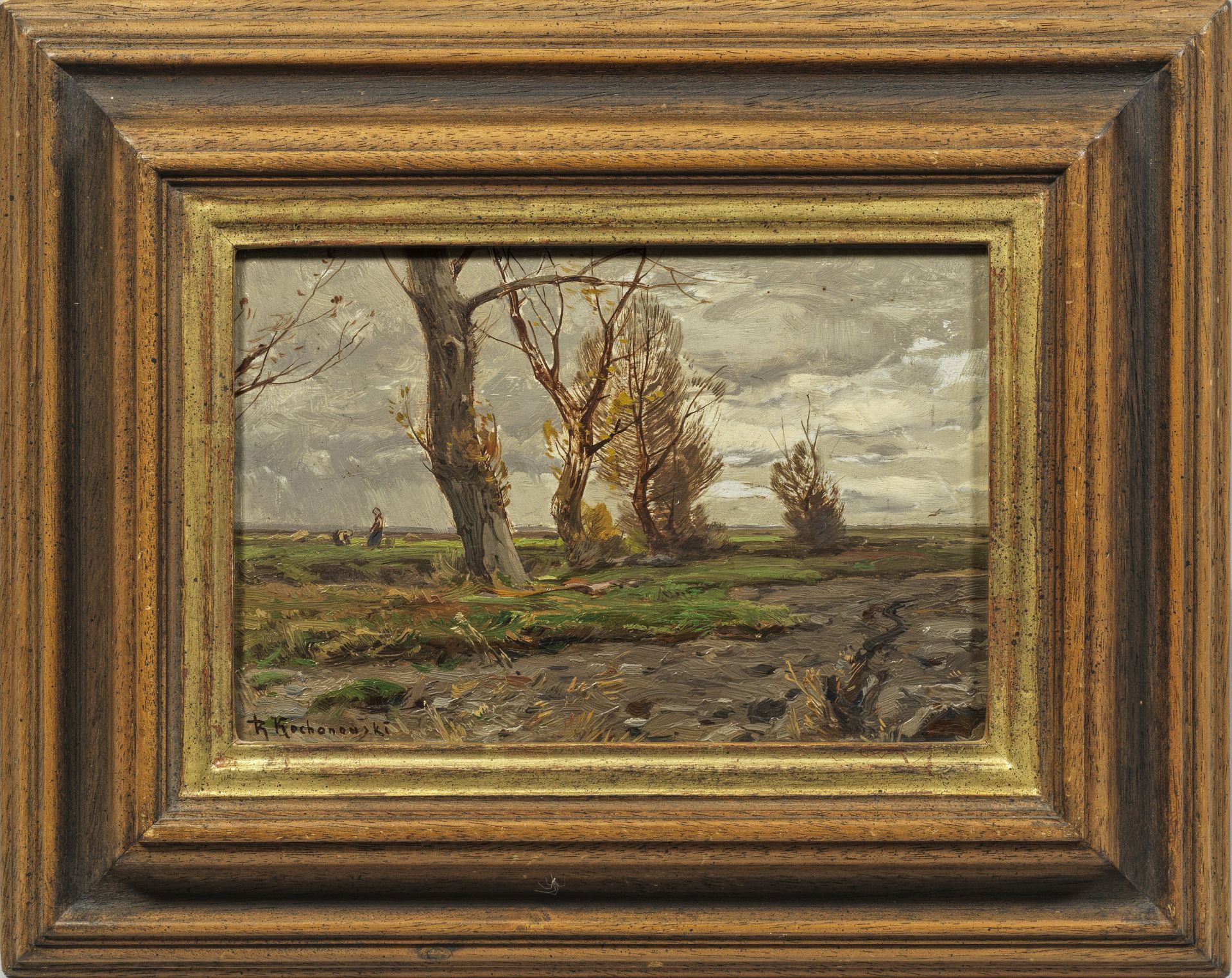 Lot 1881. Roman Kochanowski (1856 Krakau – 1945 Freising). Impressionistische Landschaft bei München. Motiv- und stiltypisches Werk Kochanowskis, einem der besten polnischen Landschaftsmaler seiner Generation und letztem Repräsentanten der polnischen Kunstszene in München. Er studierte an den Akademien in Krakau und Wien; 1888 lernte er auf einer Paris-Reise die Werke von Jean-Baptiste Corot und der Schule von Barbizon kennen, die sein weiteres Schaffen beeinflussten. Kochanowski stellte ab 1877 aus und wurde mehrfach ausgezeichnet; Werke befinden sich in den Museen in Krakau, Warschau und Posen. Öl/Holzafel. L. u. sign.; 16,5 cm x 24,5 cm. Rahmen. Oil on panel. Signed. Opening 2,200 euro. Schloss Ahlden. 12/03-05/21. Sold 6,500 euro