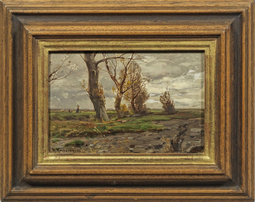 Lot 7041. “Stürmischer Herbsttag“, kleinformatiges Gemälde, Öl auf Holztafel, ca. 16,5 x 25 cm, unten links signiert: R. Kochanowski = Roman Kazimierz Kochanowski ( Krakau 1856 – 1945 Freising) studierte an der Akademie in Krakau & Wien, er lernte auf einer Paris – Reise die Werke von z. B. Carot & die Schule von Barbizon kennen, die sein weiteres Schaffen beeinflusste. Er stellte seine Werke ab 1877 aus & wurde mehrfach ausgezeichnet, Arbeiten von ihm u.a. in Museen in Krakau, Posen & Warschau. Rückseitig mit geklebtem Papierzettel mit Künstlerinfo & Titel des Werkes, diverse handschriftliche Notizen & Nummern. Rahmen beigegeben, max. Außenmaß ca. 40 x 47 cm. Opening 1,300 euro. Neumanns Auktionen. 01/14/23. Sold 4,400 euro