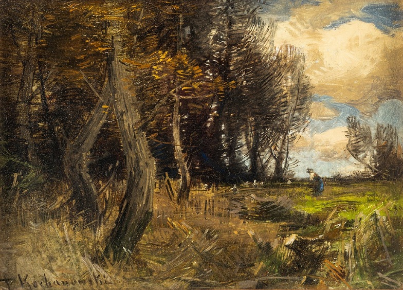 Ta cena sprzedaży była okazyjnie niska. Roman Kochanowski malował wnętrza lasu, bajecznie złociste jesienią, czasami z jeziorkiem, rzeczką dodając pochyloną figurę babiny zbierającej chrust. Ładny obrazek