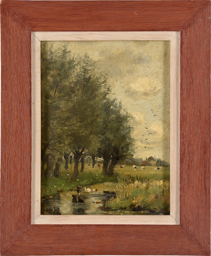 (Krakau 1856-1945) Landschaft mit Bauern an einem Gewässer, signiert unten links: R. Kochanowski, Öl auf Holz, ca. 13 x 17,5 cm, verglast, Rahmen des 19. Jahrhunderts, dieser beschädig