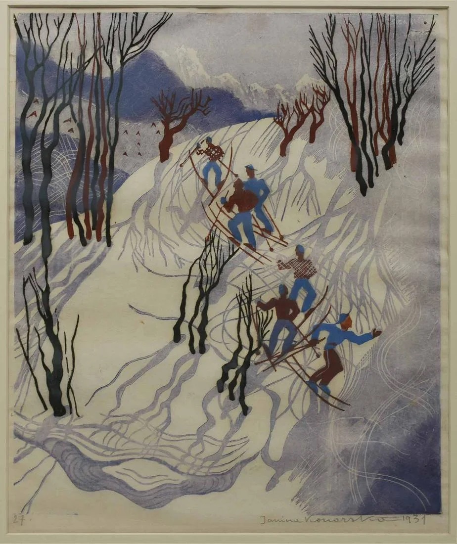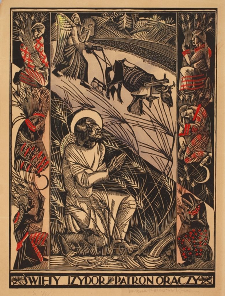 Lot 3837. Janina Konarska-Słonimska, Saint Isidore the patron saint of ploughmen, farmers and day labourers, surrounded by ears of corn, inscribed under image in print in Polish “Swiety izydor patron oraczy” (Saint Isidore, (Saint Isidore, patron saint of ploughmen), coloured woodcut, 1925-30, signed in pencil below the image on the right “Ianina Konarska” and inscribed on the left “Si 761/11”, slight creases and browned, dimensions approx. 35,4 x 26,5 cm, sheet dimensions ca. 38,5 x 29,5 cm. Artist info: actually Janina Seideman, Polish painter and graphic artist (1900 Łódź to 1975 Warsaw), descended from a Jewish family of textile manufacturers, studied at the Academy of Fine Arts in Warsaw under Władysław Skoczylas, adopted the artist’s name Konarska in 1918, entered the art competitions for the Olympic Games in Los Angeles in 1932 with the woodcut “Stadium” and won second place in the graphics category, married the writer Antoni Słonimski in 1934, fled to Paris with her husband in 1939 and to Great Britain in 1940, returned to Poland in 1951, source: Wikipedia. Estimate 80 – 120 euro. Mehlis. 02/25/23. Sold 800 euro
