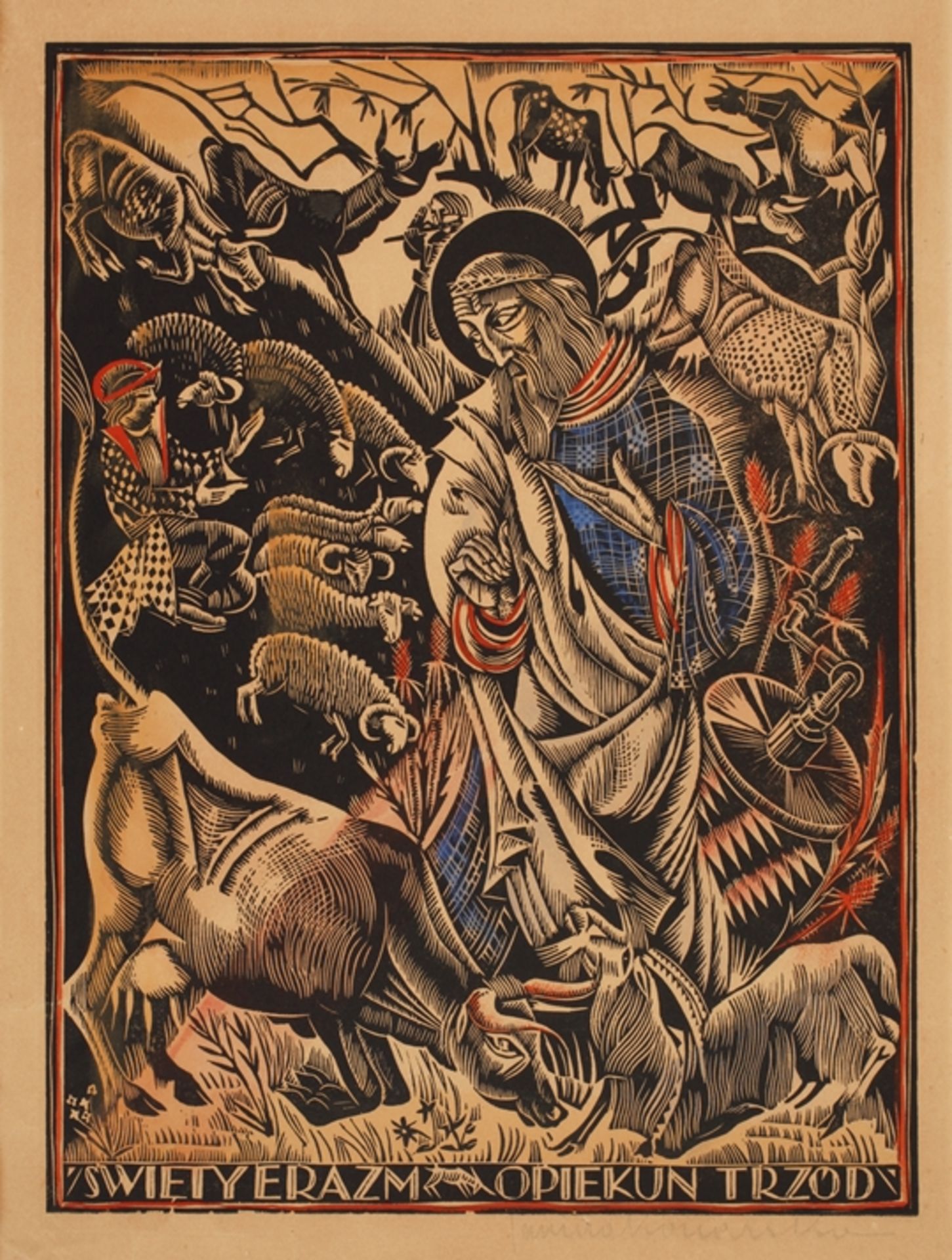 Lot 3836. Janina Konarska-Słonimska, Saint Erasmus Erasmus of Antioch surrounded by numerous animals, inscribed in the lower part of the image “Swiety erazm opiekun trzod” (Saint Erasmus, protector of the herds), coloured woodcut, c. 1925-30, signed in lead below the image on the right “Ianina Konarska”, slightly creased and yellowed, image dimensions approx. 35,5 x 26,5 cm, sheet dimensions ca. 40 x 30 cm. Artist’s info: actually Janina Seideman, Polish painter and graphic artist (1900 Łódź to 1975 Warsaw), descended from a Jewish family of textile manufacturers, studied at the Academy of Fine Arts in Warsaw under Władysław Skoczylas, adopted the artist’s name Konarska in 1918, entered the art competitions for the Olympic Games in Los Angeles in 1932 with the woodcut “Stadium” and won second place in the graphics category, married the writer Antoni Słonimski in 1934, fled to Paris with her husband in 1939 and to Great Britain in 1940, returned to Poland in 1951, source: Wikipedia. Estimate 80 – 120 euro. Mehlis. 02/25/23. Sold 900 euro