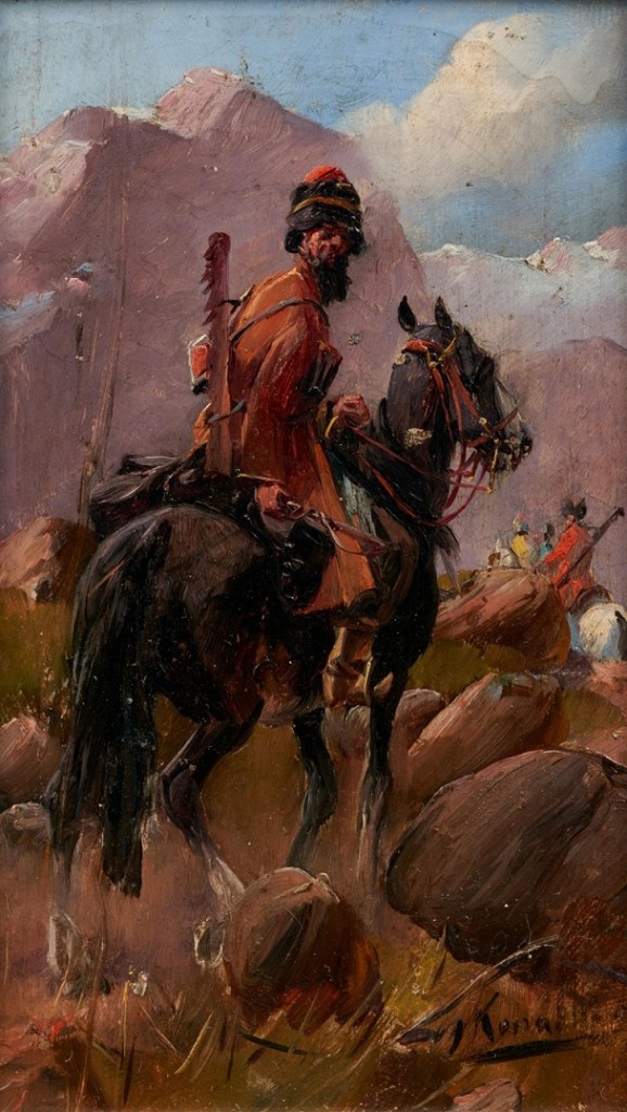 Lot 239. WIERUSZ-KOWALSKI, ALFRED VON(‘J. Konarski’) 1849 Suwlaki – 1915 München. Kosakenreiter. Öl auf Holz. 14 x 8,5cm. Mit Pseudonym signiert unten rechts: Konarski. Estimate 1,000 – 1,5000 euro. Van Ham. 01/26/21