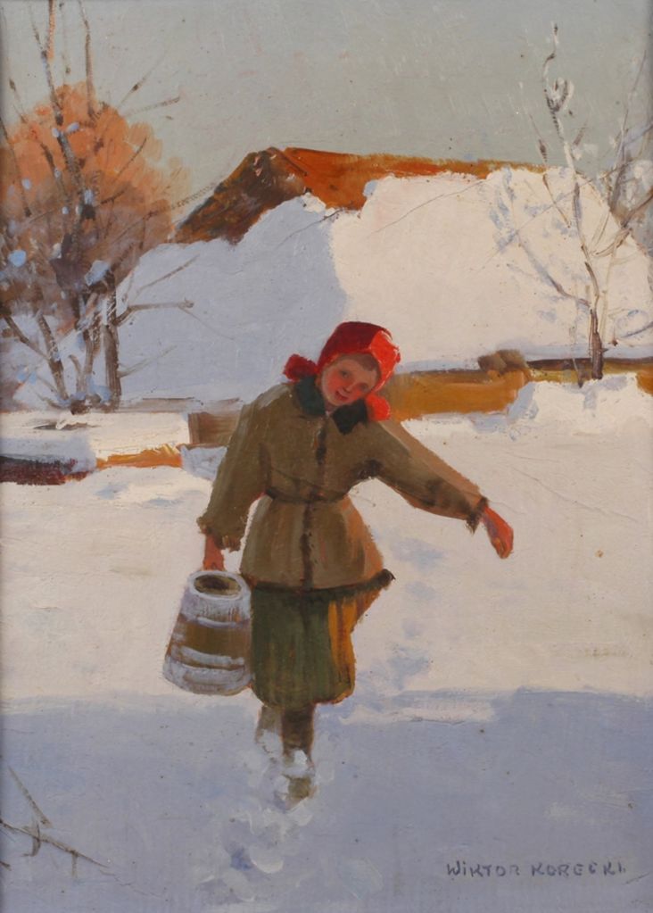 Lot 4299. Wiktor Korecki, Wasser tragendes Mädchen durch hohen Schnee aus einem Bauernhof laufendes Mädchen mit hölzernem Wasserbottich, leicht pastose Malerei, Öl auf Pappe, rechts unten signiert “Wiktor Korecki”, rückseitig bezeichnet und datiert “Zakopane 18.3.1934”, leichte Knickspuren, gerahmt, Falzmaße ca. 38,5 x 28,5 cm. Künstlerinfo: polnisch-ukrainischer Landschaftsmaler (1890 Kamjanez-Podilskyj bis 1980 Milanowek), Schüler des Gymnasiums in Kiew, studierte an der Akademie Kiew bei Nicholas Muraszki, anschließend Rückkehr nach Kamieniec Podolski, ab 1921 freischaffend im eigenen Atelier in Warschau, 1944 Zerstörung des Ateliers während des Warschauer Aufstandes und Deportation in ein Zwangsarbeitslager nach Leipzig, 1946 Rückkehr nach Polen und tätig in Komorów, später in Milanówek, Quelle: polnische Wikipedia. Starting 100 euro. Mehlis. 05/27-29/21