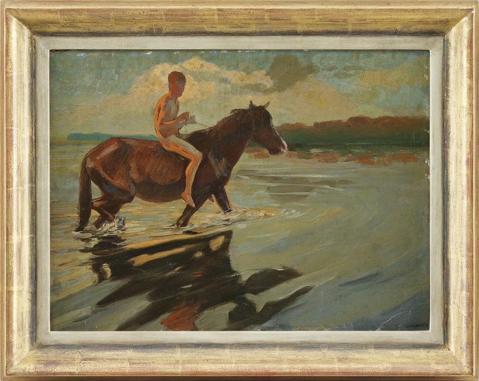 4661947. STANISLAW KORZENIEWSKI (POLEN 1882-1942). Young rider on horseback at the beach. Oil on panel, 43 x 57,5 cm, including frame 55 x 69 cm. Signed Korzeniewski. Estimate €546. Stockholms Auktionsverk. 11/30/25