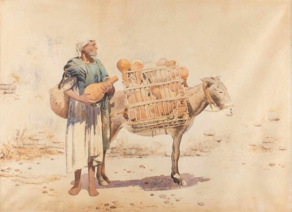 Lot 1783. WILHELM (VASSILI) ALEXANDROVICH KOTARBINSKI 1848 Nieborow/ Poland – Kiev 1921. An oriental merchant with hollow-ware. Water colour on paper, visible size 52,5 by 73 cm, min. damaged, partially browned, behind glass. A comparable work of the painter was sold in London by Sotheby’s (25. Nov. 2008 Lot 435). Reserve 2,000 euro. Hargesheimer. 11/16/19